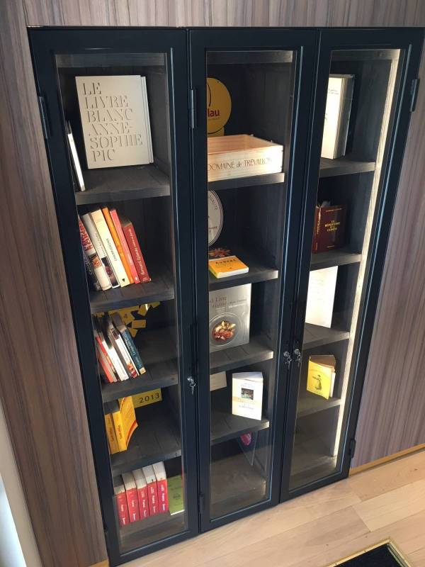 Il a pu garnir cette vitrine munie de multiples étagères, de bibelots, d'objets et de livres.
