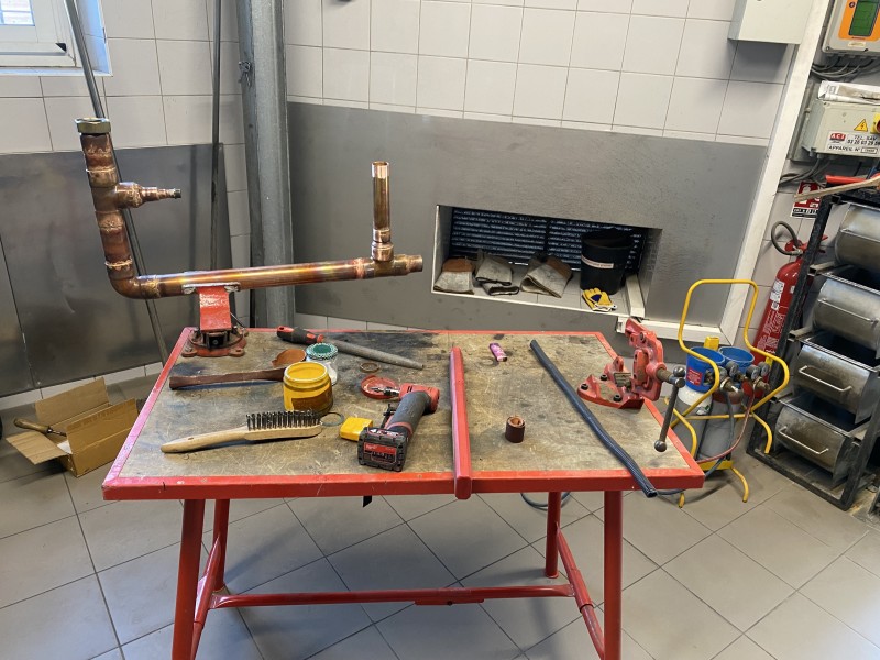 En amont de la fabrication, nous avons veillé à ce que tous les raccords en laiton ainsi que les tubes en cuivre indispensables soient rigoureusement approvisionnés. La réalisation de la nouvelle panoplie a débuté dans les règles de l’art, en prenant grand soin de ne pas reproduire les défauts de l’ancienne installation. L’assemblage s’est opéré par brasure argent, incluant une sur-longueur sur trois raccords à visser afin de faciliter l’ajustement sur place lors du remontage.